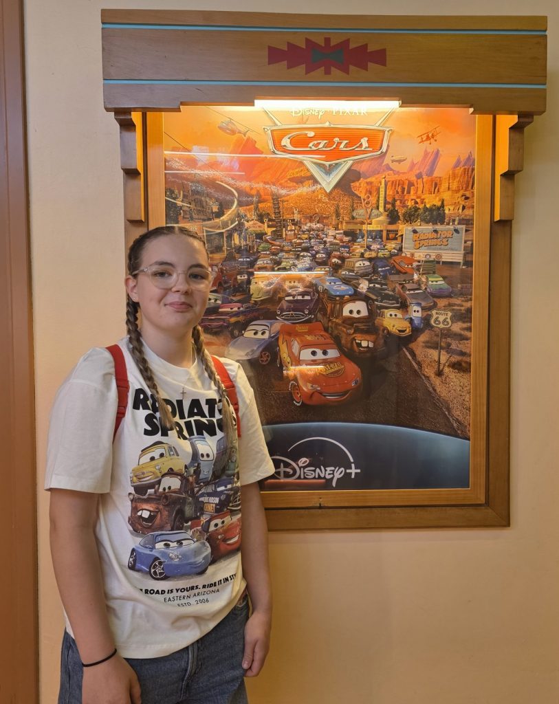 We were it Tow Mater section, right by the bridge to Cheyenne! This was a win as it meant we could get either bus back or walk and be close to our room. We were on the 3rd floor. Our room was clean and fresh when we walked in. Me and Rubi flopped on the bed. I took my shoes off at this point and realised how swollen my left foot was… whoops! I ran some cold water in the bath and just sat on the edge with my feet in. Rubi joined me and then Leni decided she wanted in too!